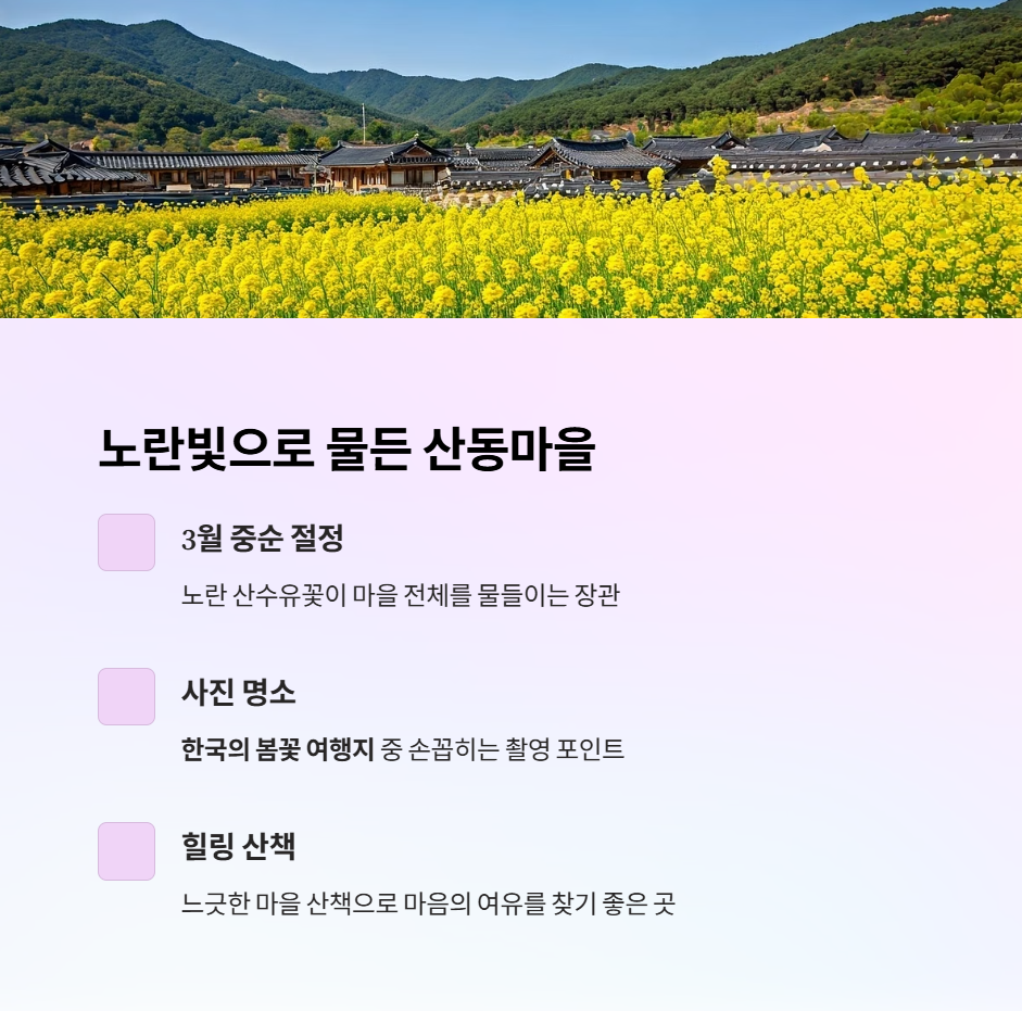 매년 3월 중순이면 노란 산수유꽃이 마을 전체를 물들이며