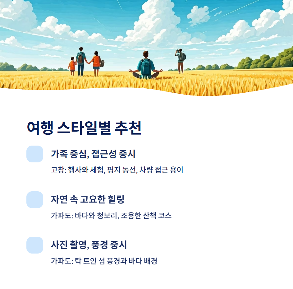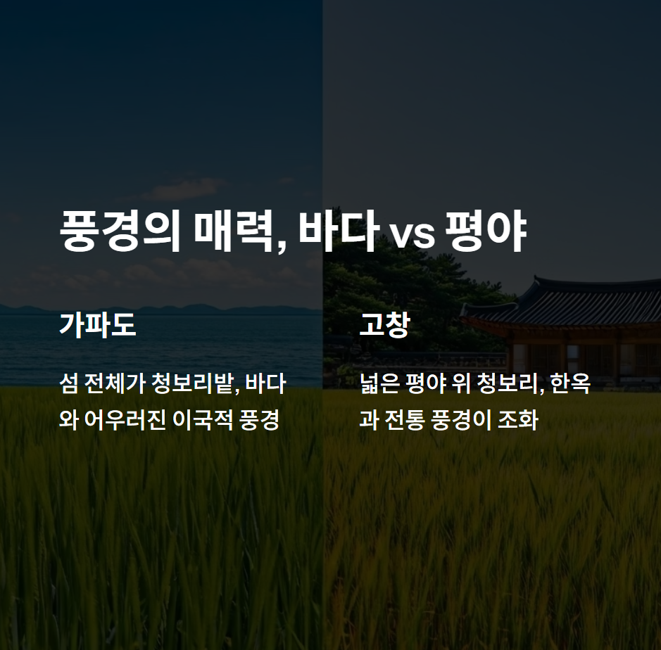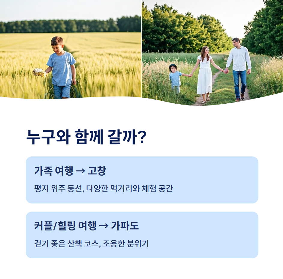 결론적으로, 짧고 편한 여행을 원하면 고창, 감성적인 섬 여행을 원한다면 가파도가 더 어울립니다.