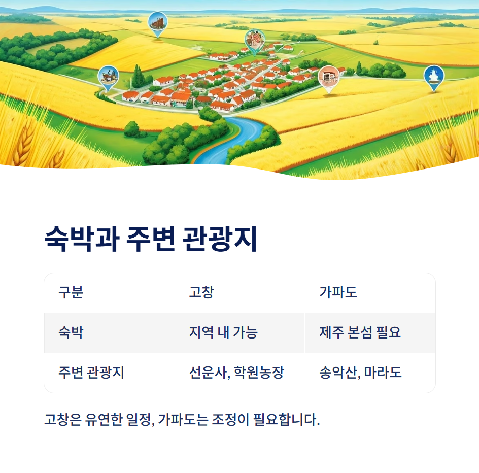 여행 일정에 따라 고창은 유연하고, 가파도는 일정 조정이 필요합니다.