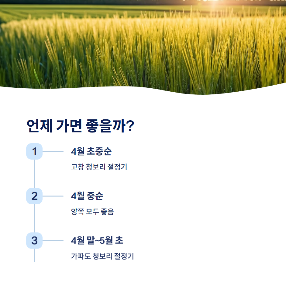 4월 초중순에는 고창, 4월말~5월초에는 가파도를 추천합니다.