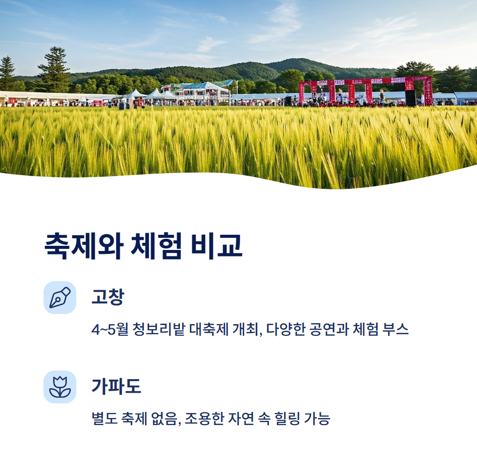 행사나 체험이 중요하다면 고창, 한적한 풍경이 우선이라면 가파도입니다.