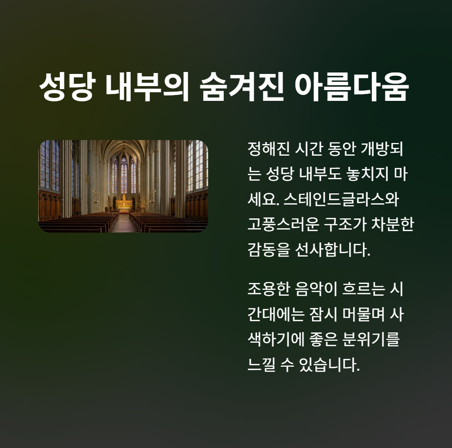 정해진 시간 동안 개방되는 성당 내부도 들러보는 걸 추천합니다.