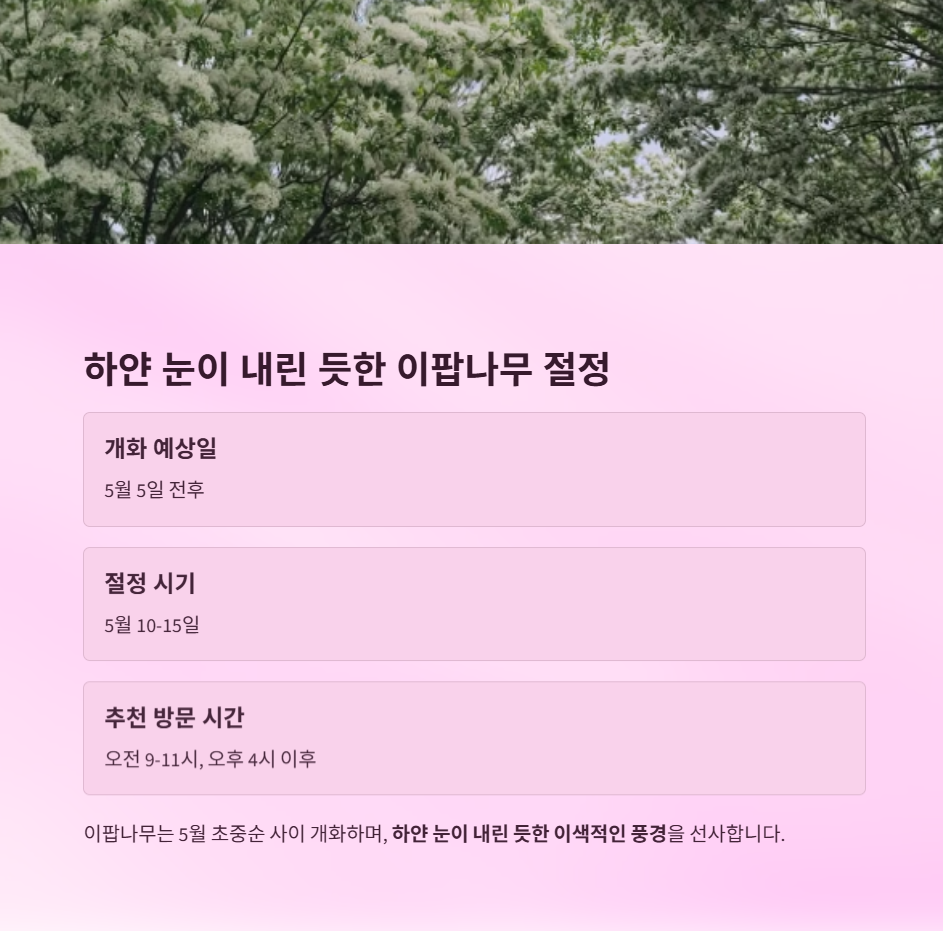 | 개화 예상일 | 절정 시기 | 추천 방문 시간대 |
