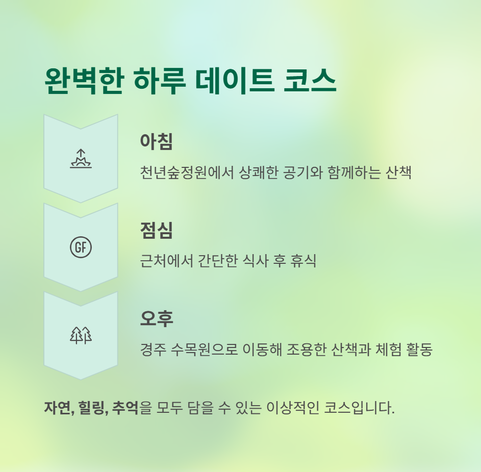 이처럼 천년숲정원과 수목원은 자연이 데이트의 배경이자 대화의 중심이 되는 곳입니다.