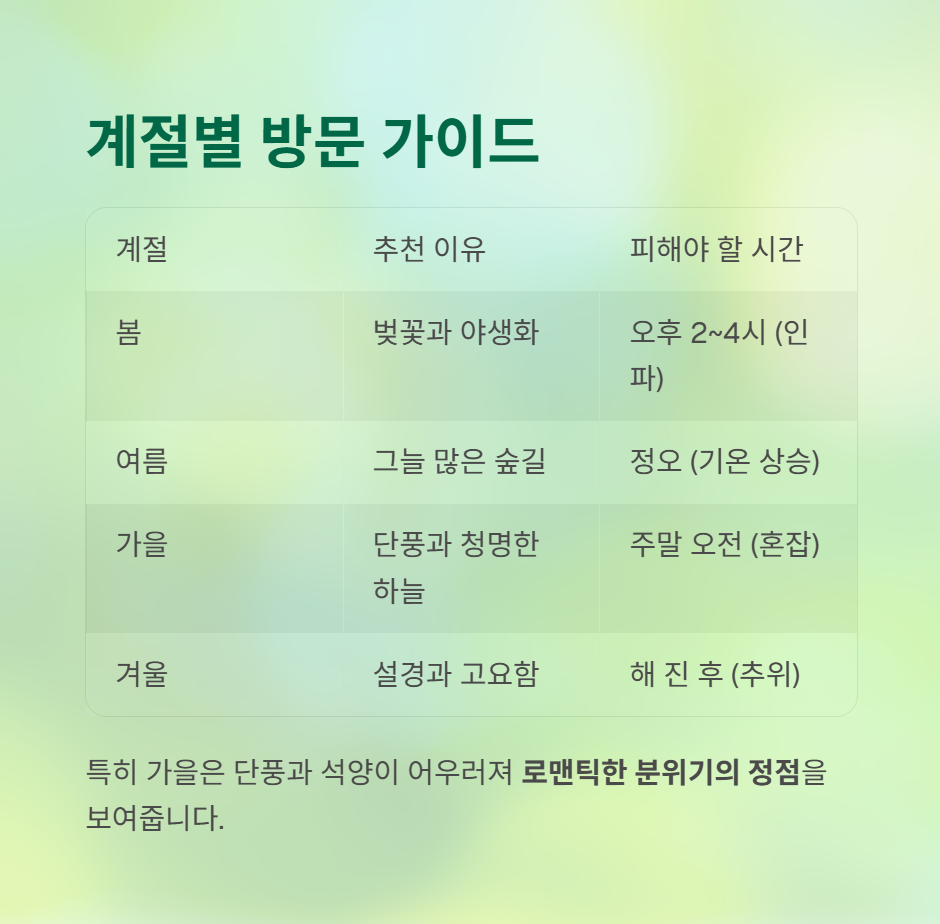 | 봄 | 벚꽃과 야생화가 아름다움 | 오후 2~4시 (인파 많음) |