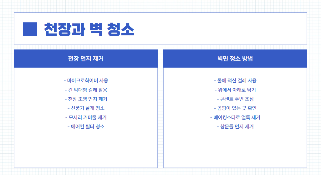 많은 분들이 놓치는 부분이 천장과 벽이에요. 하지만 먼지는 위에서 아래로 떨어지기 때문에 천장과 벽을 먼저 닦아야 해요.