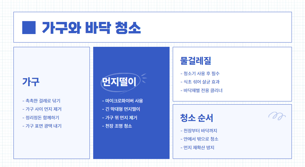 - 정리정돈 먼저! 청소 전 정리를 먼저 해야 먼지를 효과적으로 제거할 수 있어요.