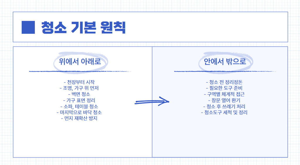 청소할 때 무작정 시작하면 먼지가 다시 쌓이기 마련이에요. 기본 원칙을 지키면서 청소해야 효과적이에요. 👌