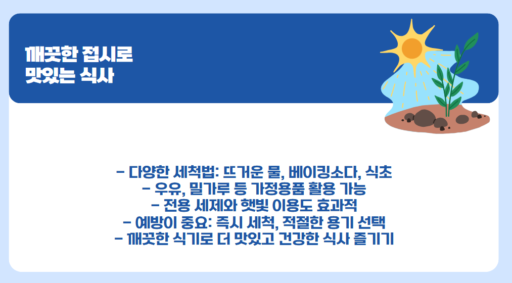 - 설거지를 한 후 물기를 제거하지 않고 햇볕이 드는 곳에 놔둬요.