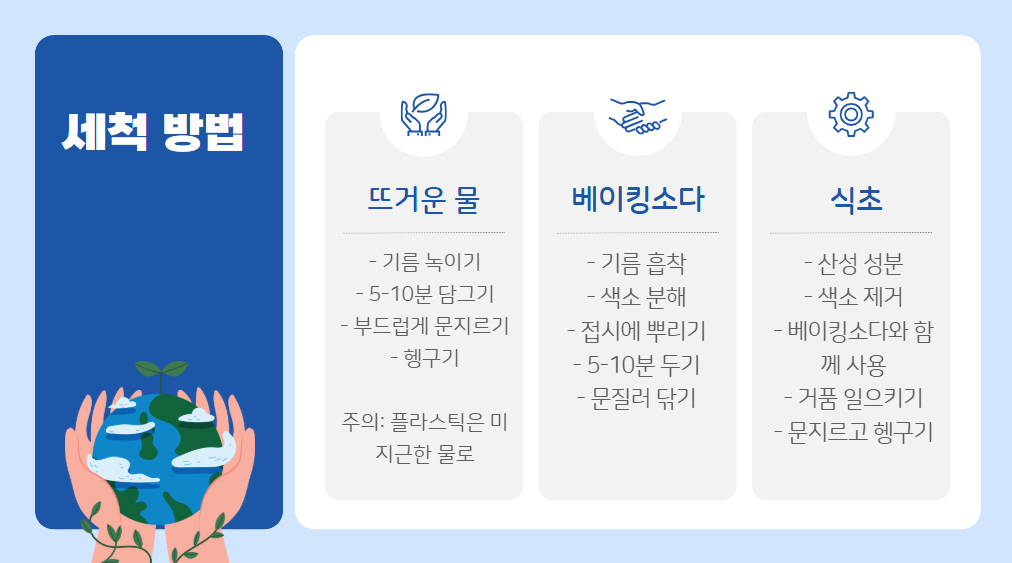 기름 성분과 색소를 분해하는 세척법이 필요해요!