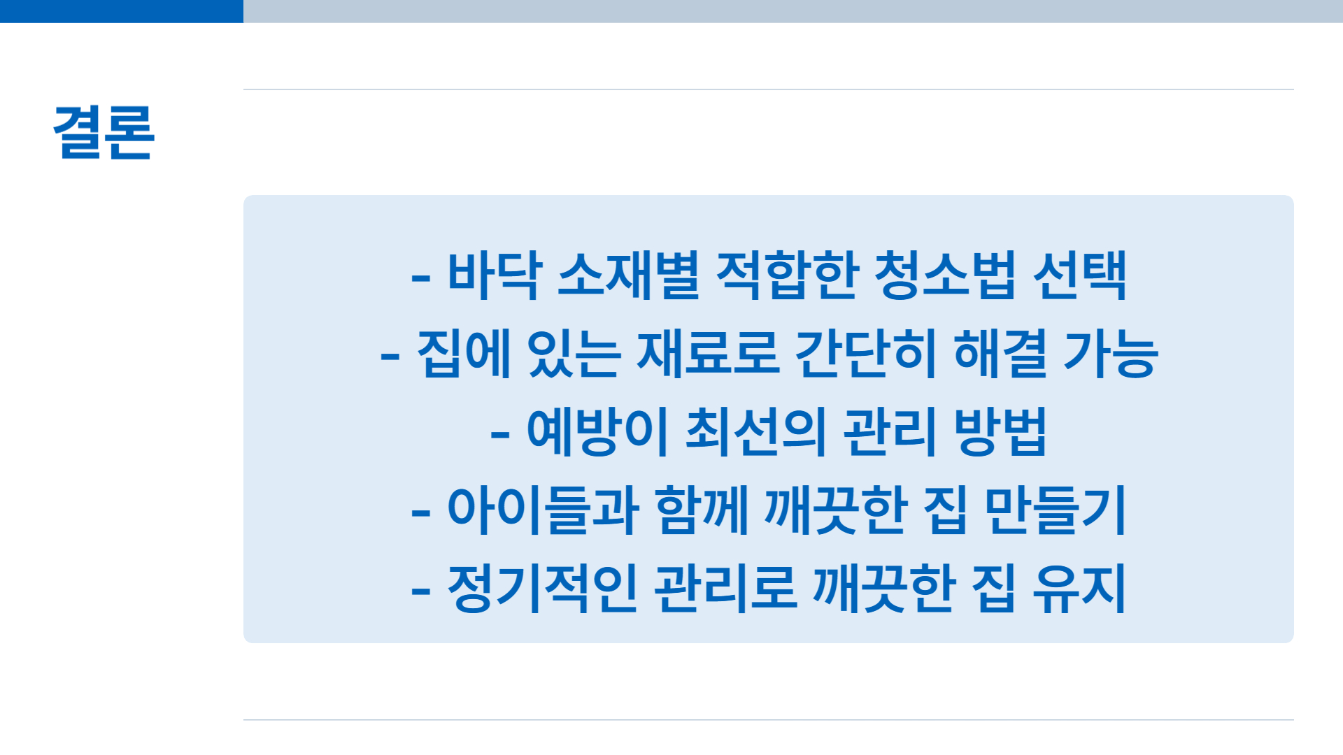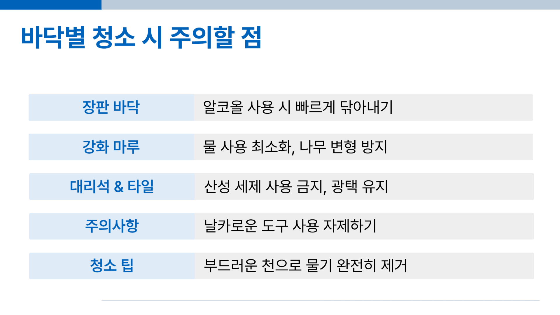 바닥 소재에 맞춰 적절한 청소법을 선택하고, 미리 예방하는 습관까지 들여보세요! 😊
