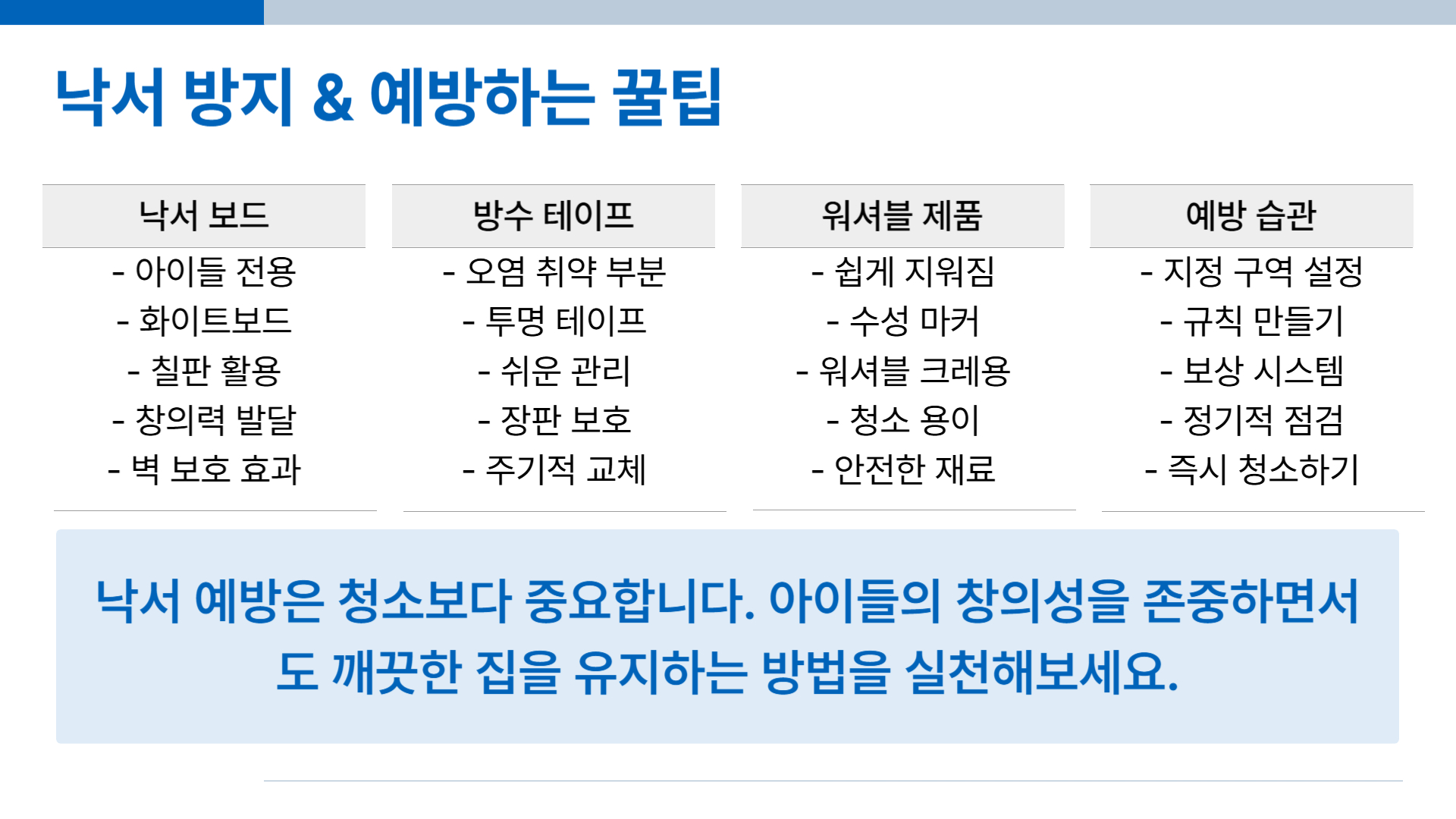 - 쉽게 지워지는 워셔블 크레용이나 수성 마커를 사용하면 청소가 훨씬 편해요.