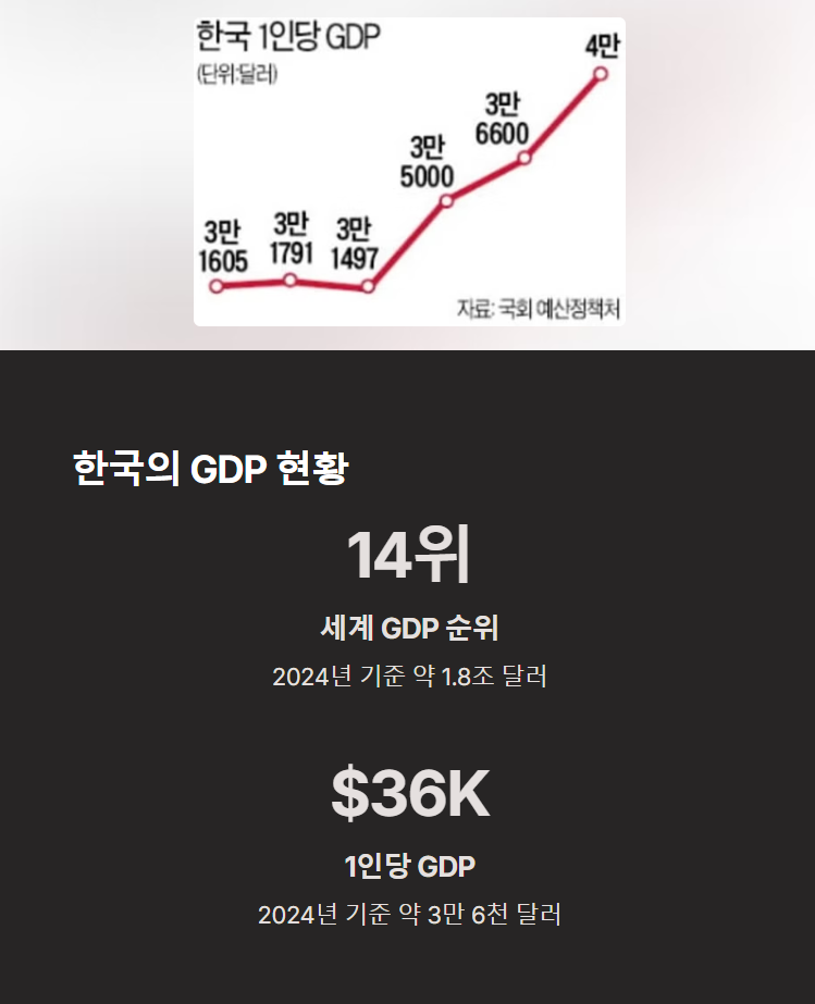 - 2024년 한국 GDP: 약 1.8조 달러(세계 14위)