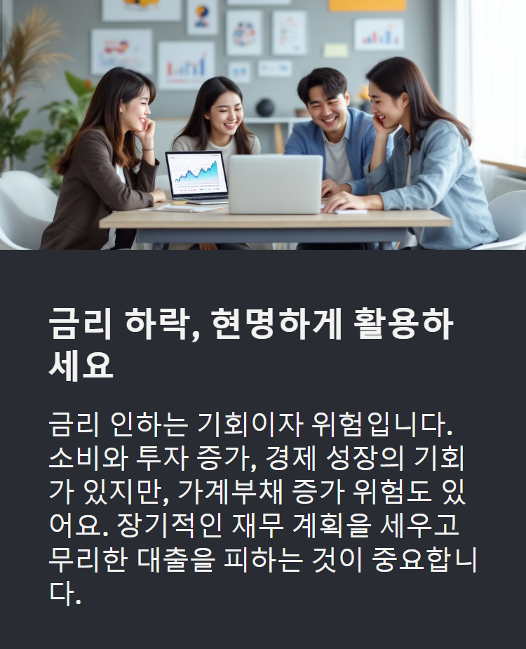 금리는 경제의 핵심 요소 중 하나예요. 금리가 내려가면 대출 부담이 줄어들고 소비와 투자가 늘어나지만, 반대로 예금 이자가 줄고 가계부채 부담이 커질 수도 있어요.