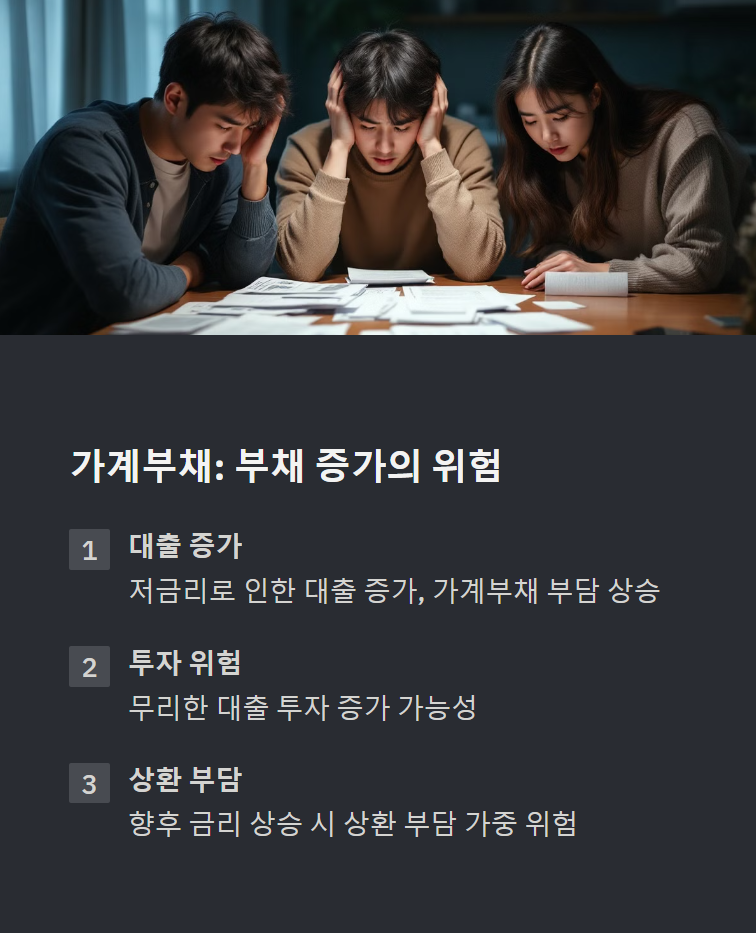 금리가 낮아지면 대출을 받는 부담이 줄어들어 가계부채가 증가할 가능성이 있어요.
