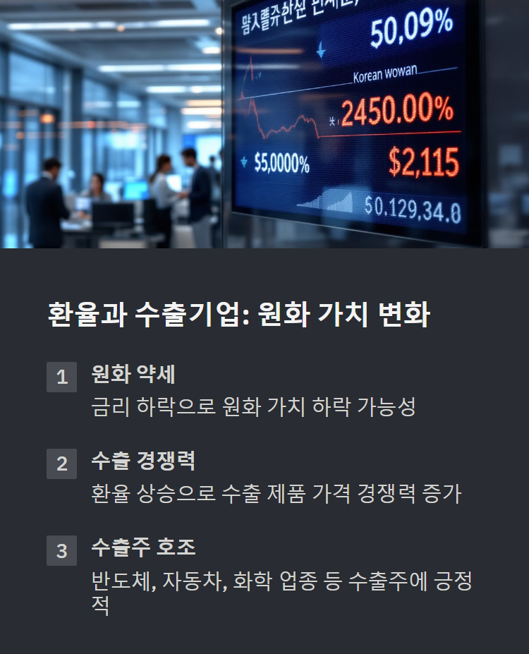 금리 인하는 보통 원화 가치 하락(환율 상승)으로 이어질 가능성이 있어요.