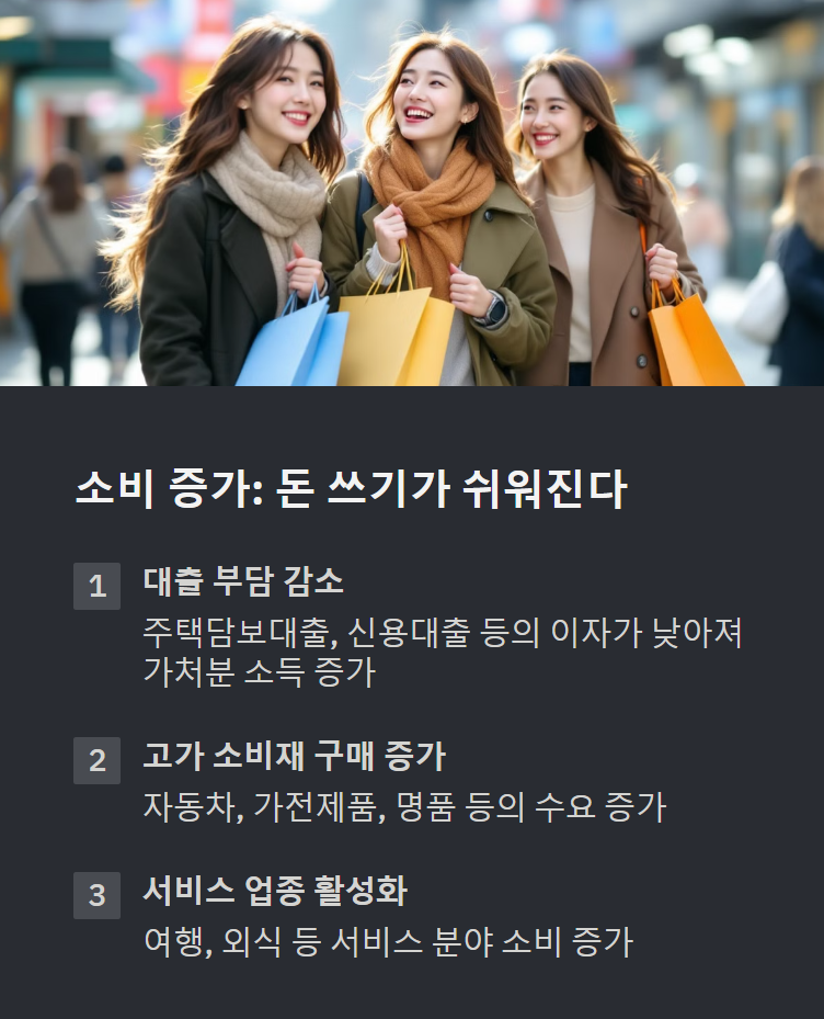 금리가 낮아지면 대출 이자가 줄어들면서 소비 여력이 커질 가능성이 높아요.