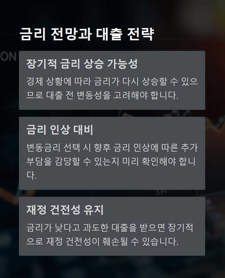 금리는 경제 상황에 따라 다시 상승할 수도 있어요. 대출을 받기 전에 금리 변동 가능성을 고려해야 해요. - 대출 이후 금리 인상 대비 필요