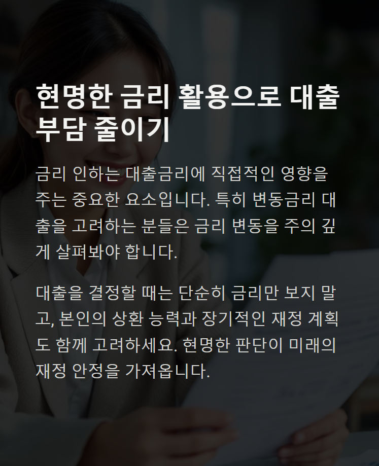 변동금리 대출은 기준금리에 따라 자동으로 변해요. 금리가 내려가면 이자 부담이 줄어들어 대출을 유지하기가 쉬워져요. - 고정금리 대출은 영향이 제한적