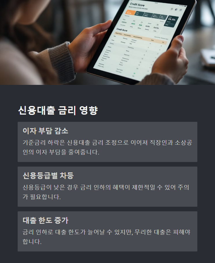 기준금리가 낮아지면 신용대출 금리도 조정될 가능성이 커요. 이는 직장인이나 소상공인에게 긍정적인 소식이에요. - 신용등급에 따른 차등 적용