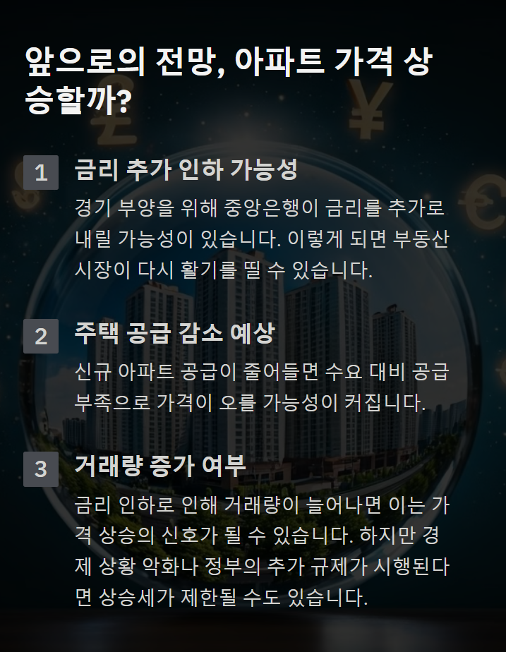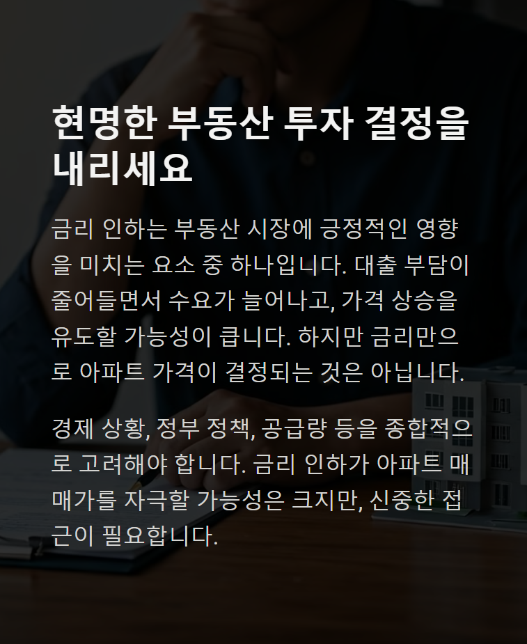 하지만 금리 인하가 아파트 가격을 무조건 올리는 것은 아니에요.