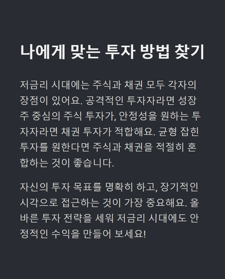 특히 저금리 시대에는 성장 가능성이 높은 종목을 발굴하는 것이 중요해요. - 안정성을 추구하는 투자자 → 채권