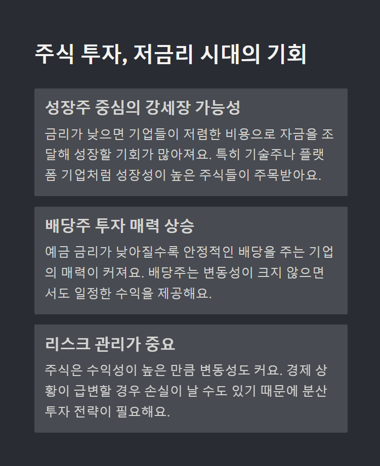 금리가 낮으면 기업이 대출받기 쉬워지고, 이는 투자 확대와 성장으로 이어질 수 있어요. - 예금 이자 하락으로 투자처 변화
