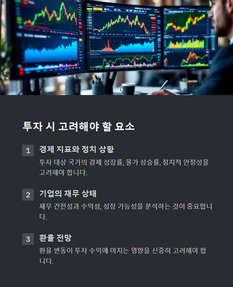 투자 대상 국가의 경제 성장률, 물가 상승률, 정치적 안정성을 고려해야 해요. - 기업의 재무 상태 확인