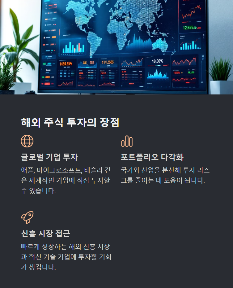 해외 주식 투자는 국가와 산업을 분산해 투자 리스크를 줄이는 데 도움이 됩니다. - 신흥 시장 및 혁신 산업 접근 가능