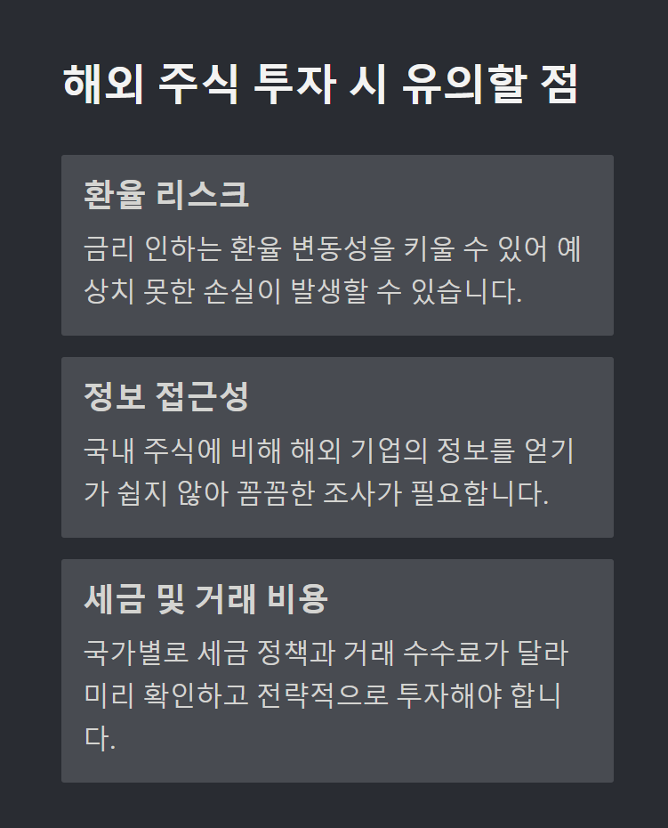 하지만 해외 주식 투자는 몇 가지 유의해야 할 점도 있습니다.