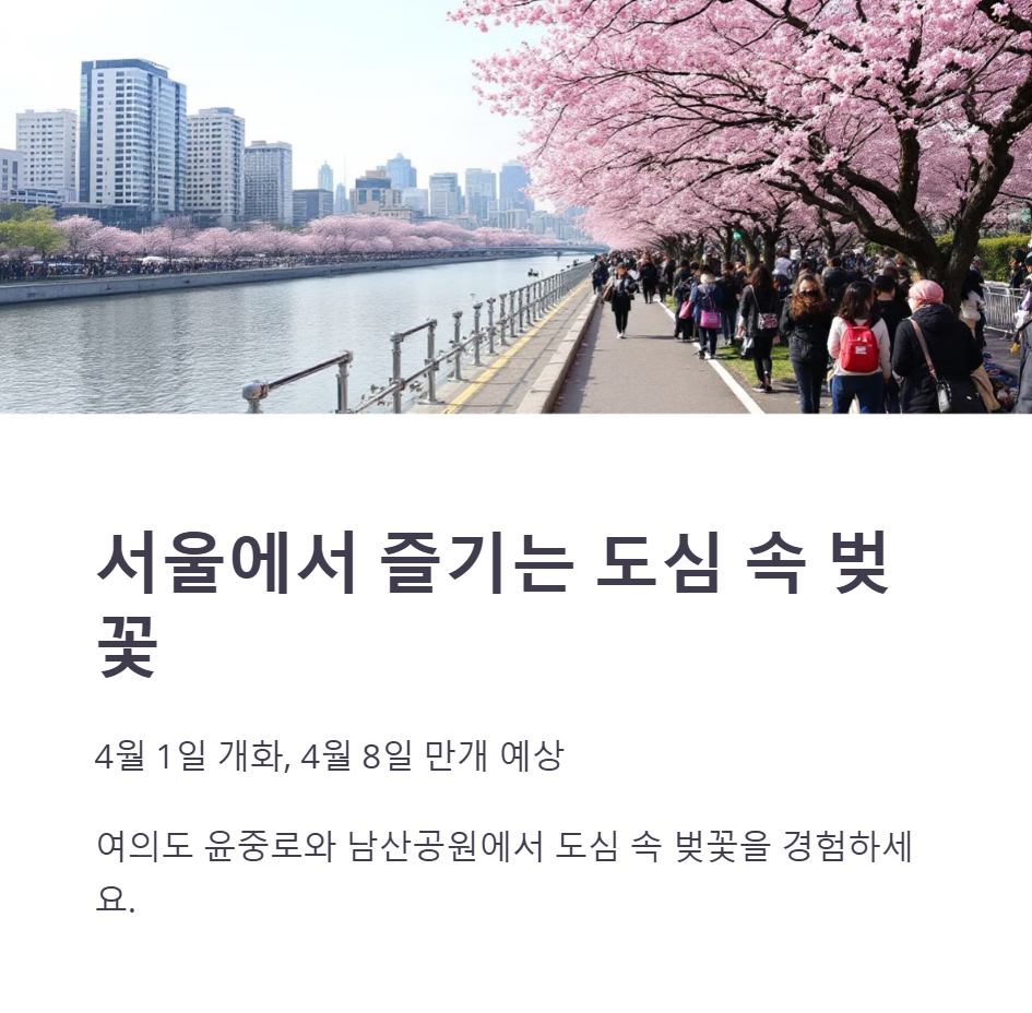 매년 봄이 오면 우리 마음은 자연스럽게 벚꽃을 떠올리게 됩니다. 특히 3월과 4월은 전국 각지에서 벚꽃이 만개하는 시기로, 잠시 일상을 내려놓고 벚꽃길을 따라 걸으며 봄의 기운을 만끽하기에 가장 좋은 시기입니다. 바쁜 일상 속에서도 한 번쯤은 꼭 떠나고 싶은 계절 여행지, 바로 벚꽃 명소인데요. 전국의 벚꽃 개화 시기와 아름다운 풍경을 자랑하는 대표적인 여행지를 소개해드릴게요. 특히 제주도부터 서울까지 지역별로 시기와 장소가 조금씩 다르기 때문에 여행 계획을 세우기에 앞서 정확한 개화 정보와 추천 장소를 미리 알고 가신다면 더욱 알찬 벚꽃 여행이 되실 수 있습니다. 오늘은 2025년 3월부터 4월 사이에 방문하면 좋을 벚꽃 명소와 지역별 추천지를 정리해보았습니다. 이번 봄, 당신의 사진첩에 가장 아름다운 장면이 담기길 바랍니다.