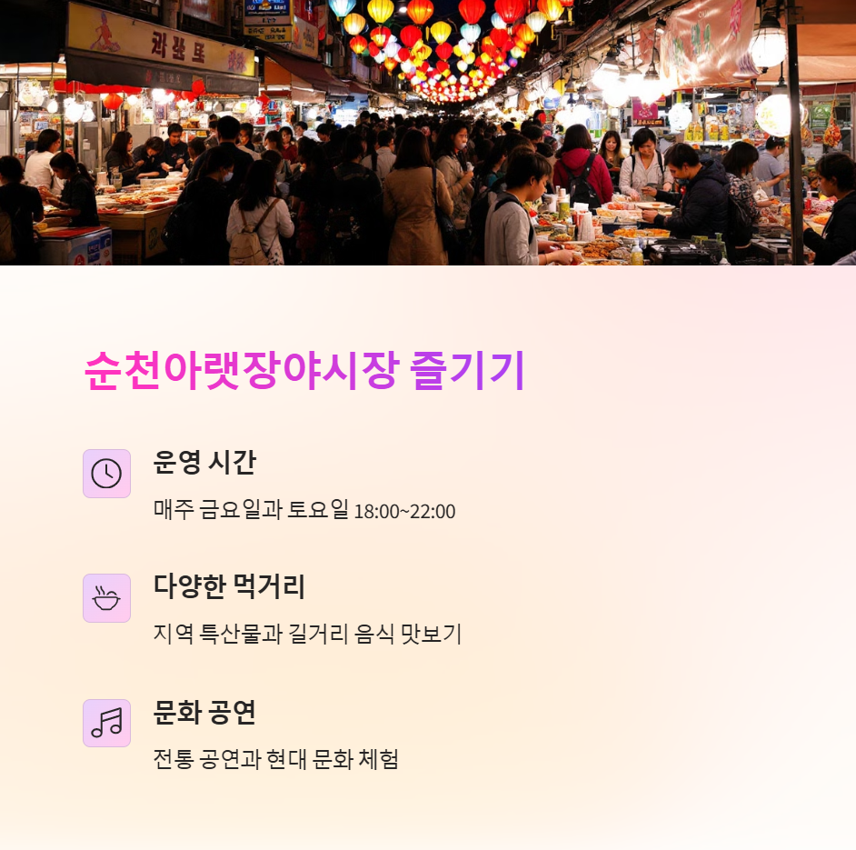 순천만국가정원 관람 후 저녁 무렵에는 순천아랫장야시장을 들러보세요. 매주 금요일과 토요일 오후 6시부터 밤 10시까지 운영되며, 전통시장의 감성과 현대적인 감각이 조화를 이루는 공간입니다. 수제 어묵, 꼬치, 떡볶이, 닭강정 등 다양한 길거리 음식부터 지역 특산물로 만든 요리까지 풍성하게 준비되어 있어 야시장만의 활기찬 분위기를 만끽할 수 있습니다. 무엇보다 다양한 버스킹 공연과 체험 프로그램이 마련되어 있어 먹거리뿐만 아니라 문화적으로도 즐길 거리가 가득합니다. 특히 외국인 관광객들에게도 인기 있는 명소로, 순천의 숨겨진 매력을 느낄 수 있는 밤 여행 코스로 추천드립니다.