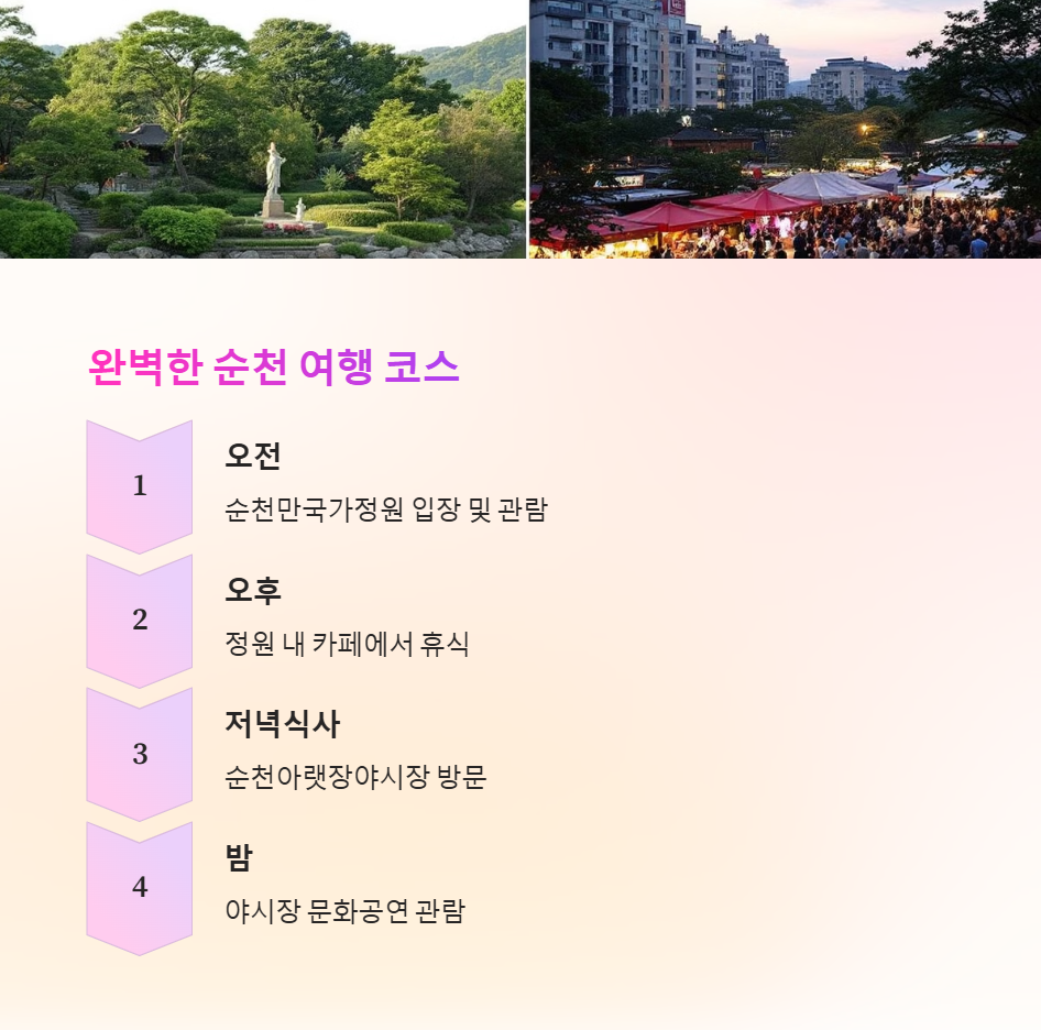 순천 여행을 계획할 때, 이 두 명소를 하루에 함께 구성하면 이동 동선이 효율적이고 여행의 밀도도 높일 수 있습니다. 순천역에서 순천만국가정원까지는 버스로 약 20분, 정원에서 야시장까지도 대중교통으로 15분 정도로 접근성이 좋습니다. 낮에는 자연을 만끽하고 밤에는 활기찬 시장 문화를 경험할 수 있어 하루 코스로 전혀 무리가 없고, 특히 주말에만 열리는 야시장 시간에 맞춰 일정을 계획하면 더욱 알찬 여행이 됩니다. 여행 중 사진 촬영을 즐긴다면 정원의 포토존과 야시장의 조명들이 SNS용 콘텐츠로도 손색이 없습니다. 이처럼 순천은 단순한 관광지를 넘어 감성과 경험을 모두 만족시키는 여행지로 많은 사람들의 사랑을 받고 있습니다.