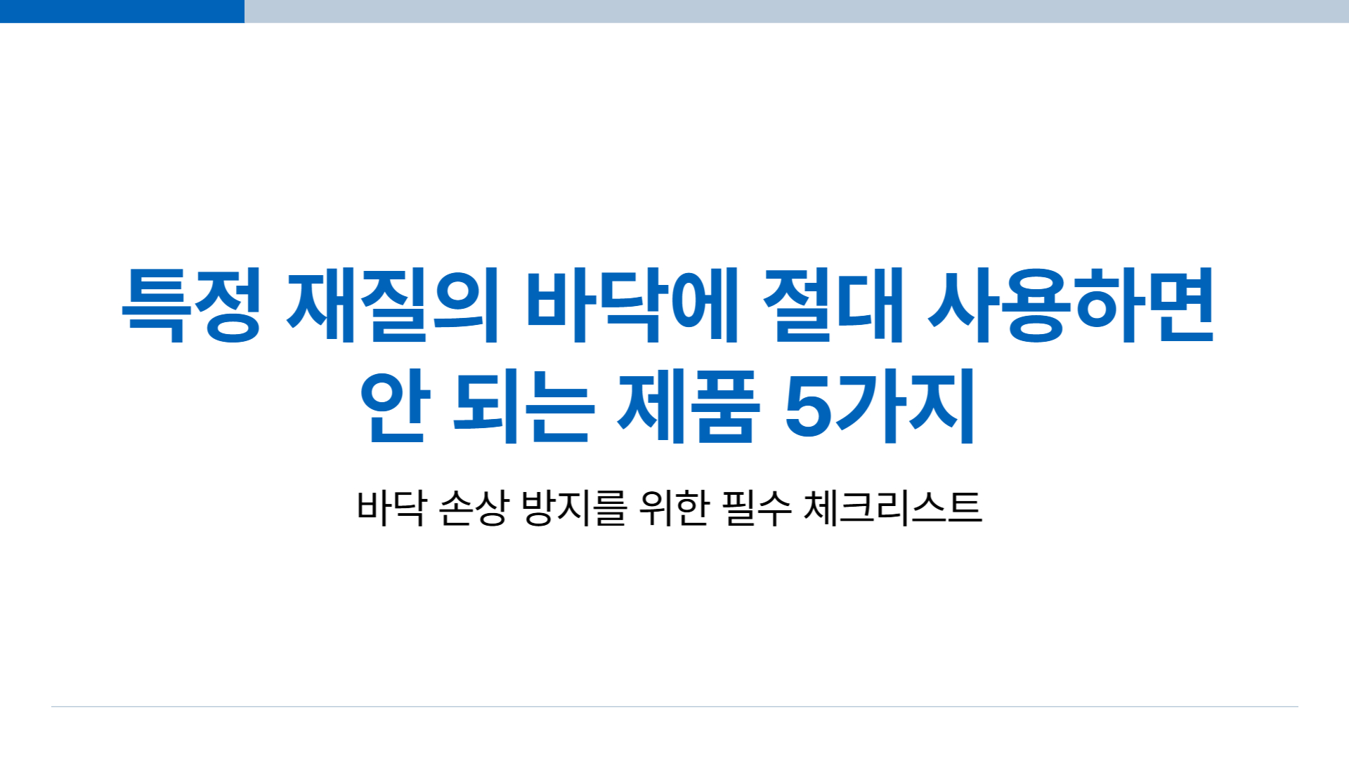 특정 재질의 바닥에 절대 사용하면 안 되는 제품 5가지! ⚠️ 바닥 손상 방지 필수 체크바닥 청소할 때 아무 세제나 막 쓰다 보면 낭패를 볼 수도 있어요! 🫣특히 특정 재질의 바닥에는 절대 사용하면 안 되는 제품들이 있는데요.오늘은 마루, 대리석, 타일, 콘크리트 등 다양한 바닥재에 치명적인 제품 5가지를 알려드릴게요!이 글을 읽고 나면 더 이상 바닥이 변색되거나 손상될 걱정 없답니다.그럼 바로 시작할게요! 😊1. 마루(원목, 강화마루) - 강한 산성 또는 알칼리성 세제❌마루 바닥은 수분에 약하고 코팅층이 보호막 역할을 해줘요.그런데 강한 산성이나 알칼리성 세제를 사용하면 코팅층이 벗겨지고 나무가 상할 수 있어요.❌ 사용하면 안 되는 제품락스(염소계 표백제)강한 알칼리 세제 (베이킹소다 과다 사용 포..